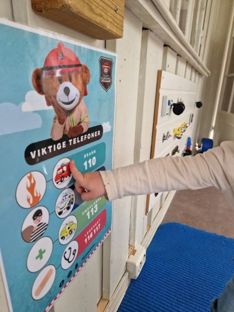 Brannvern uka- Barna ble godt kjent med hva vi gjør når brannalarmen går. Vi forbredte barna med bruk av bilder, og gangen i det som skulle skje. Vi hadde en øvelse som var varslet på forhånd, og en som ikke var det. I tillegg fikk vi oppleve enda en alarm som ikke var varslet, og brannbilen kom til og med på besøk til oss. Vi opplevde at barna var godt forberdt på hva de skulle da alarmen gikk. Det gikk fint å gå ut uten sko, selv om det var vått i bakken. Barna stod også fint på parkeringspalssen når vi hadde opprop.