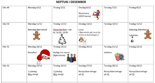 Vi må bake litt før jul. Det blir trasisjonen tro pepperkakebaking på Neptun. Bjørnehula har bakedag mandag 11. 12. Månebarna har bakedag fredag 15. 12. Barna kan gjerne ta med forkle og kjevle denne dagen om de ønsker det. Om de har med kjevle er det viktig å minne dem på at vi må dele på kjevlene våre, selv om de har emd egne.