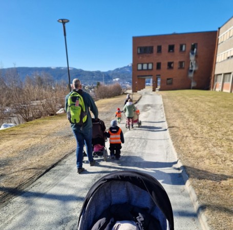 Vi har vært på gåtur, på tur til amfiet på USN og ned til bok og blueshuset. Flere av barna har gått selv, og de som har behov har fått seg en hvil i vogna. Turdagene i seg selv er en god "liv & røre" arena.